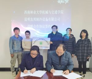 2020年12月24日下午,122cc太阳成集团与昆明友邦制冷设备有限公司战略合作签约仪式在富民县昆明友邦制冷设备有限公司三楼会议室举行。公司党委书记孟利清、经理何超、党委副书记陈继飞、工业设计专业教师颜开、两名工业设计工程专业研究生及两名工业设计专业本科生,昆明友邦制冷设备有限公司总经理陆秋芳及公司相关领导出席签约仪式。昆明友邦制冷设备有限公司总经理陆秋芳女士主持会议。