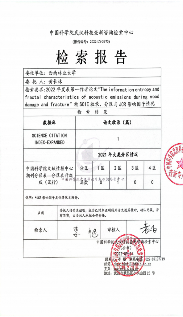 近日,122cc太阳成集团研究生在2020级硕士研究生黄长林以第一作者在《Wood Science and Technology》期刊(中科院二区,TOP期刊)上发表题为“The information entropy and fractal characteristics of acoustic emissions during wood damage and fracture”的学术论文,论文首次提出采用信息熵和信号分形维相结合的方法研究木材损伤过程声发射信号的随机性与不确定性,并依据声发射信号信息熵辨识木材损伤断裂过程应变能集中释放过程,从而为基于声发射原理的木材无损检测方法提供了新的途径。