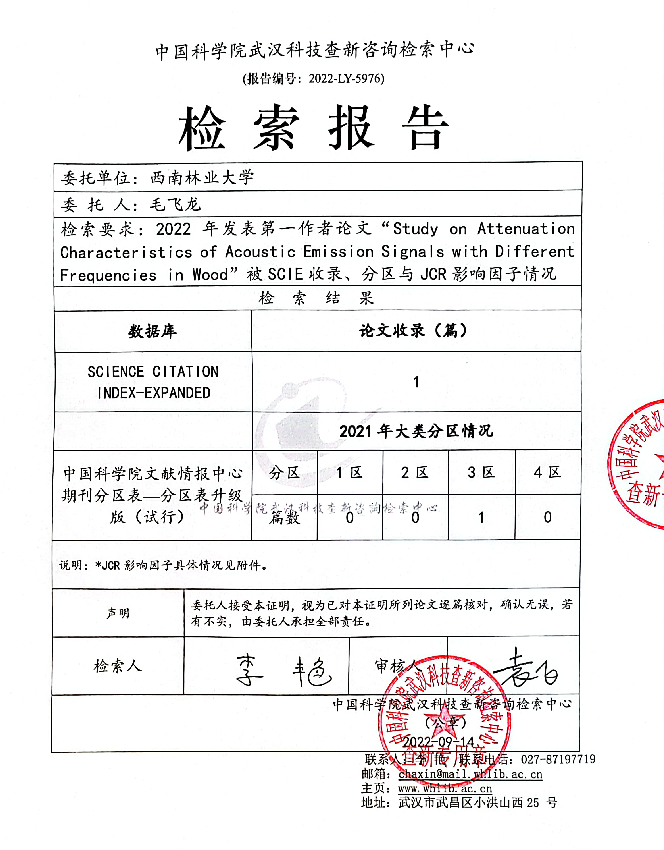 与此同时,2021级硕士研究生毛飞龙以第一作者在《Sensors》(中科院三区)上发表题为“Study on Attenuation Characteristics of Acoustic Emission Signals with Different Frequencies in Wood”的学术论文,该论文采用信号发生器对不同频率AE信号在木材中的衰减特征进行研究,并依据试验结果构造其的衰减模型,为研究木材中不同频率AE信号的传播提供了新的方法。